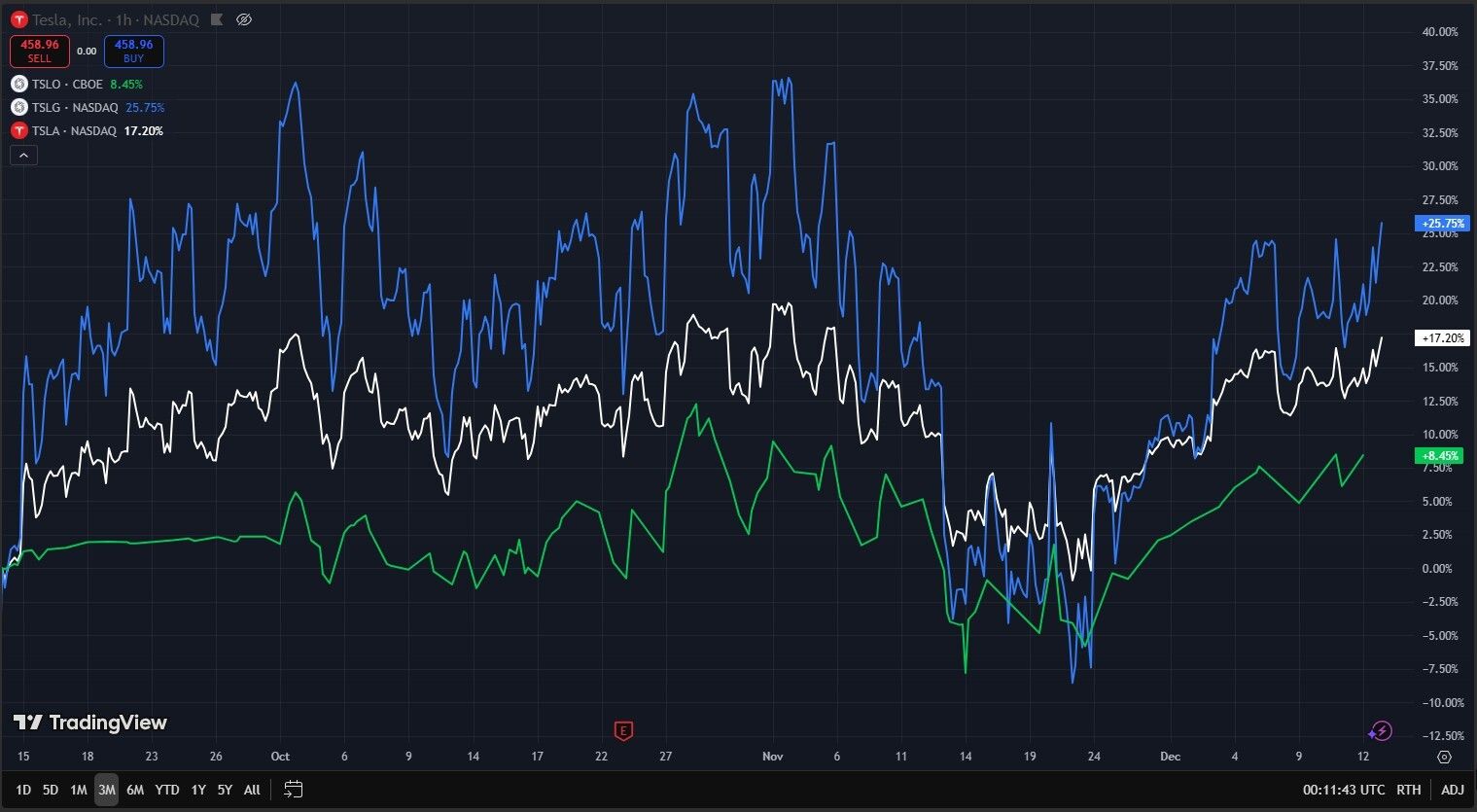 TSLA(White) vs TSLO(Green) vs TSLG(blue)