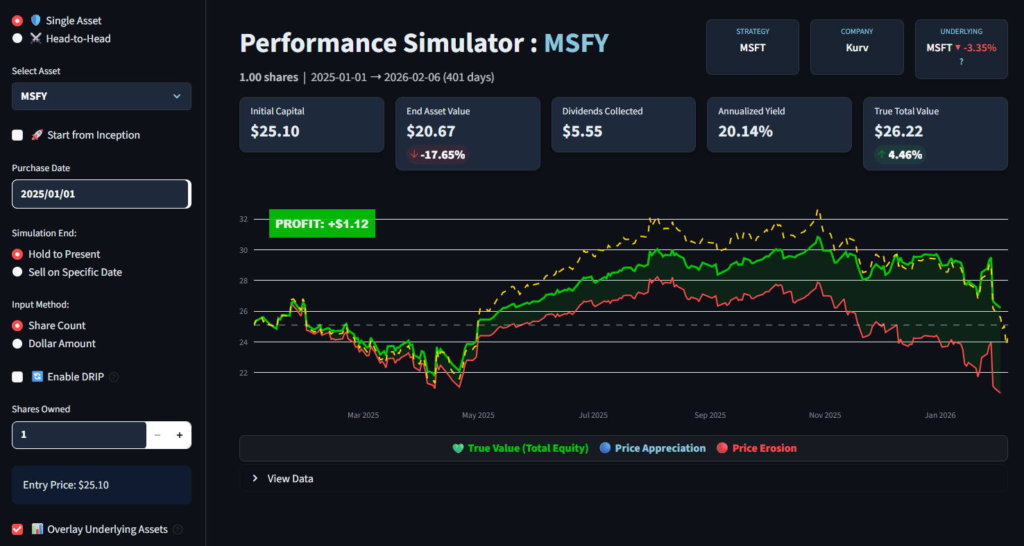 The Logic: This isn't the 100% yield of a crypto fund. This is "Sleep Well at Night" income. While MSFT stock is down 10%, Kurv is harvesting the volatility from that drop to pay you. If you believe Microsoft isn't going bankrupt tomorrow, this is how you get paid to wait for the recovery.