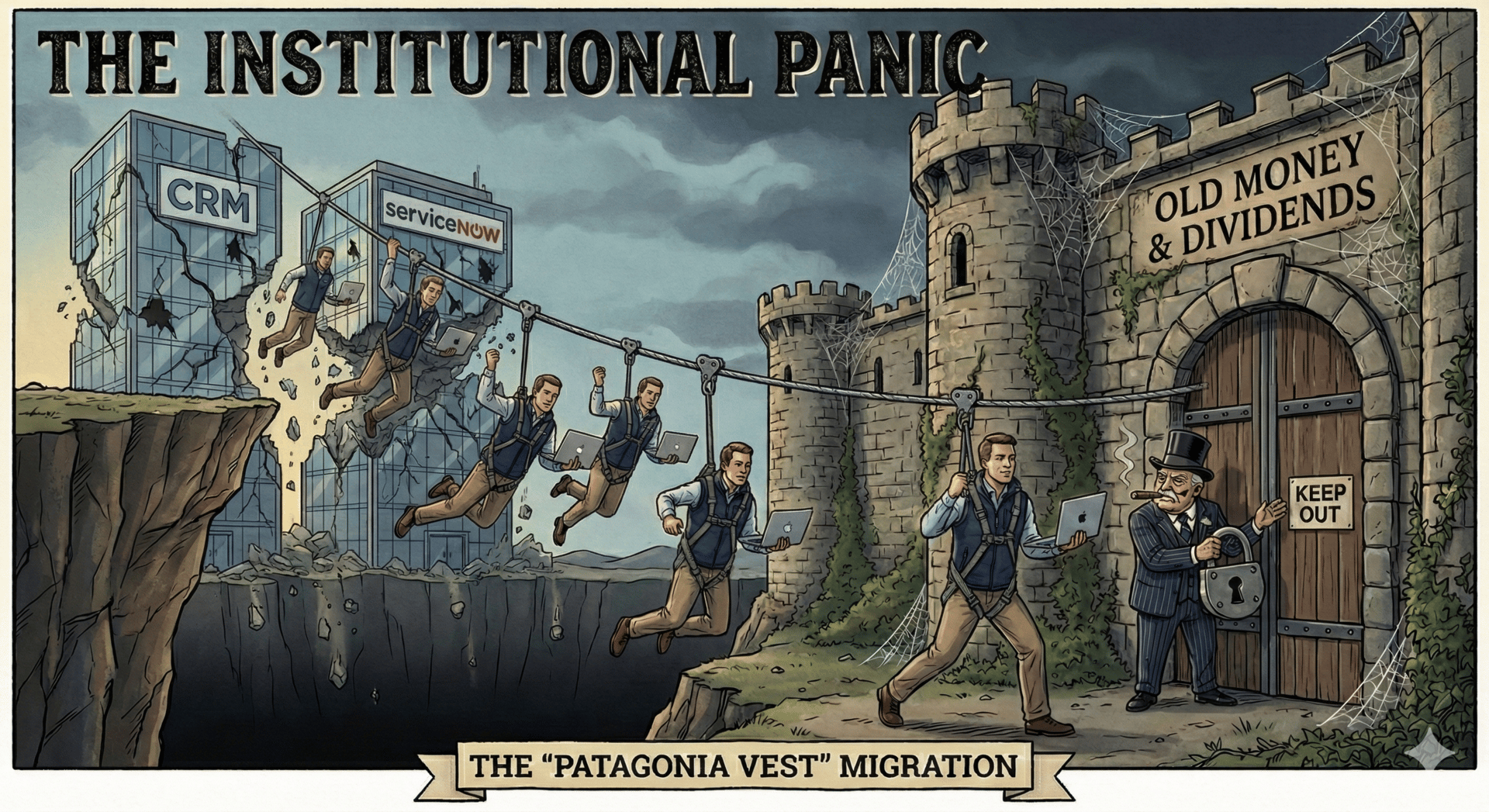 Institutions ditch CRM and ServiceNow in a panic-fueled zip-line to old money dividends. Cliffs crumbling? Even the vest elite bolts for value's moat—retail crew, snag the chaos opportunities.