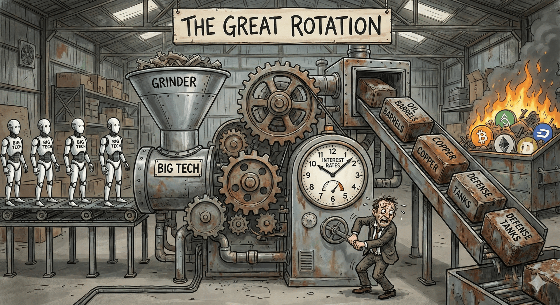 This is the "Patagonia Vest Migration." When Silicon Valley crumbles, the vest-clad elite flee to the steady moat of Value stocks. The result? The Dow Jones blasted to all-time highs above 50,000, proving that money isn't leaving the market—it’s just moving from "Growth at Any Price" to Industrials, Energy, and cash-flowing Real Assets.